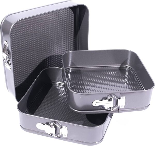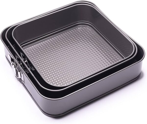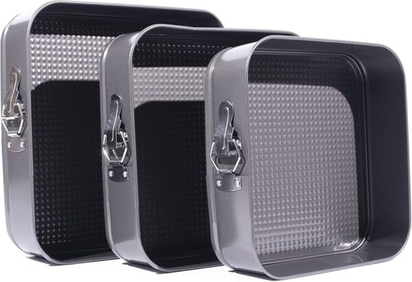 Set od tri četvrtasta kalupa za torte idealan je za pečenje kolača, peciva i drugih slatkih poslastica. Ovi kalupi sa različitim veličinama omogućavaju fleksibilnost u pripremi i savršeno oblikovane kolače za svaku priliku.